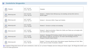 Damit kann der Owner einen Parkplatz, einzelne Stationen oder bestimmte Stellen markieren. Neben den Koordinaten kann eine zusätzliche Beschreibung angeben werden, um den Wegpunkt zu erklären. Um einen Wegpunkt (KO) hinzuzufügen, klickt man im Listing oben auf "bearbeiten" und fügt jeweils einen Wegpunkt (KO) hinzu, der einen der folgenden Typen haben kann: